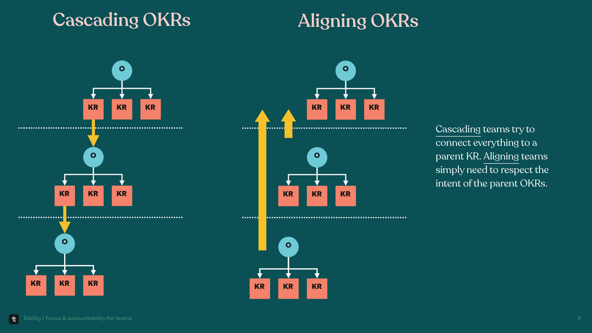 Tability does a good job in this article explaining the nuanced difference between cascading & aligning OKRs. In short, don’t use your Key Results as the Objectives in the next level of OKRs.