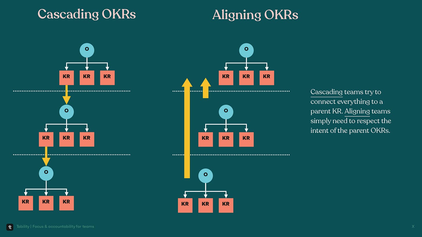 Rather than a top-down, cascading approach where key results from one level become objectives for the next, aligning OKRs empowers departments and individuals to set their own goals that contribute to the company's objectives. This fosters a sense of ownership and autonomy, encouraging creativity and innovation in achieving the company's broader vision.